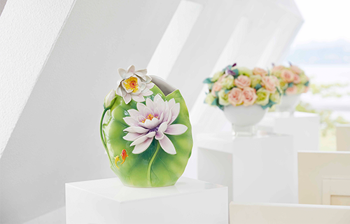 Vivid green lotus leaves adorn the exterior of the vase, from which beautiful water lilies delicately bloom. Playful fish swim amid the leaves, painting a portrait of life's leisurely pleasures.